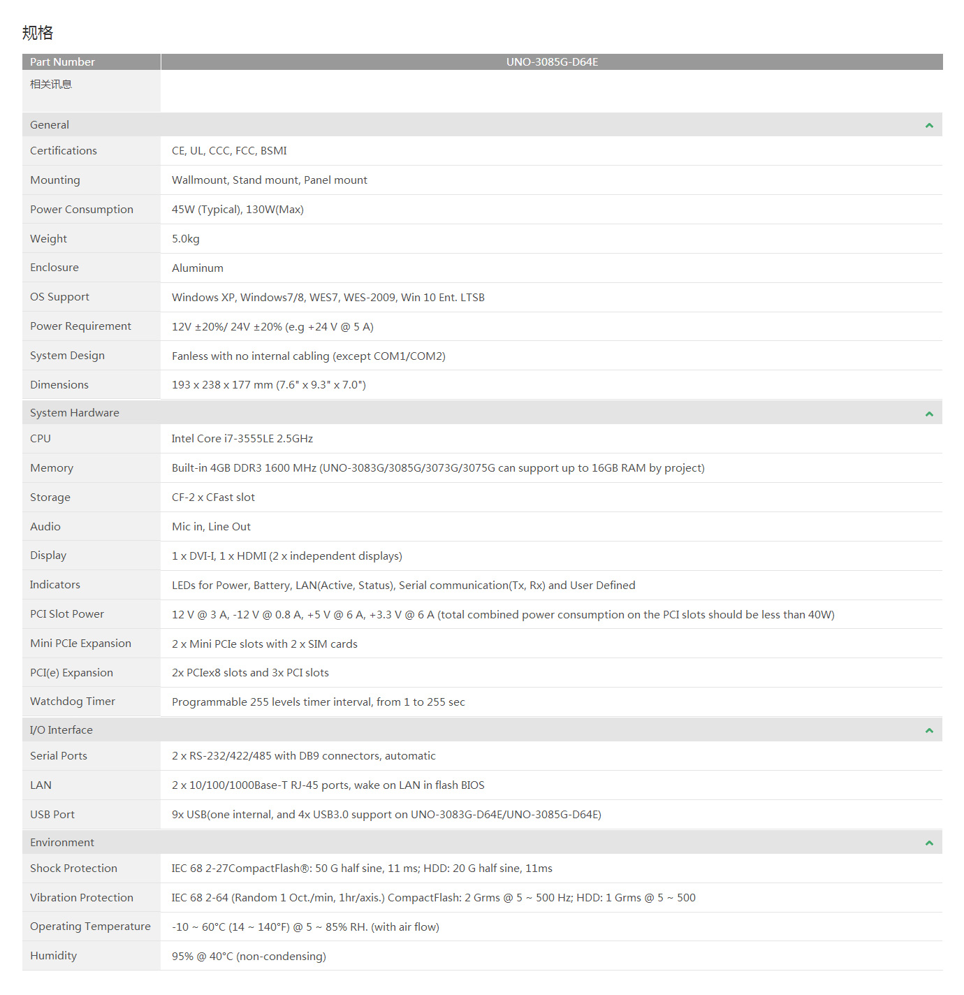 UNO-3085G是板載 Intel Core i7-2655LE, 2.2 GHz處理器,支持雙顯示、帶9個USB接口、2個Mini PCIe插槽、2個CFast卡插槽的可擴展型嵌入式無風扇工業(yè)電腦系列。它具有雙電源冗余設計與繼電器報警設計。此外,UNO-3085G前面板有兩個支持RAID 0/1的HDD/SSD支架,方便安裝、拆卸,兩個千兆以太網口具有錯容能力、負載均衡、鏈路聚合的網絡分組能力。UNO-3000G內置智能BIOS,通過繼電器功能或LED顯示,可及時診斷系統(tǒng)狀態(tài)。